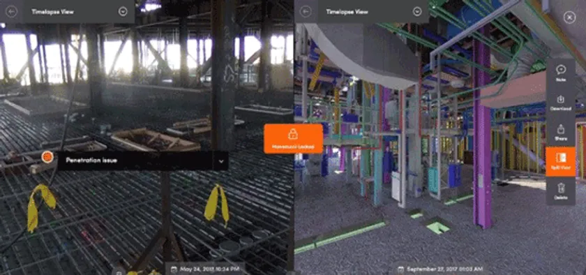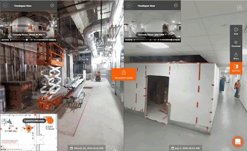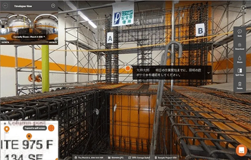 同じ撮影地点の画像を履歴で管理し、画面上で並べて表示することができるため、同じ地点の「過去と現在」の状況を対比して確認できます。また、二つの画像は連携して向きや角度を同時に動かすことができます。さらにBIMモデルを画像データとして取り込むことで、建設現場とBIMモデルとの比較も可能にします。