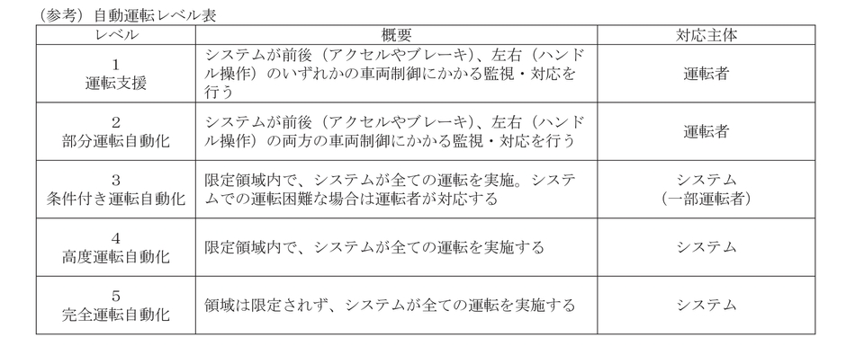 自動車の車両制御システムの一種で、運転に必要な「認知・判断・操作」の一部あるいは全部を自動で実施可能な機能を有するシステムの総称。SAE(米国自動車技術会)によってレベル0(手動運転)からレベル5までに区分される自動運転の国際的な基準。