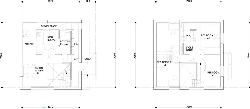 間取りは1階はリビングダイニングを中心に「共有する」スペースが集合。水まわりを集約した回遊できる空間と、階段の吹き抜けが特徴。2階はウォークインクローゼットを備えた個室と寝室で構成され、家族構成や目的に合わせてオプションで一部間取りの変更が可能です。外観および内観は100年以上住み続けても流行り廃りのない北欧の住宅デザインをベースに、長く愛されるシンプルな意匠を採用しています。