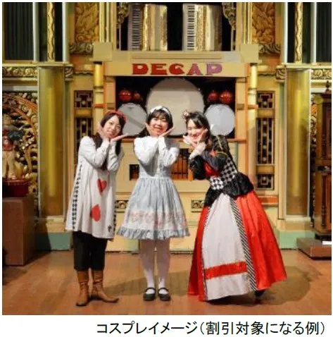 【対象】アリスのキャラクターや関連作品のキャラクターに全身のコスプレをしたお客様(入館の際、受付で審査の上、コスプレとみなされた方のみ割引対象となります。帽子やカチューシャを着けるのみ等はコスプレとみなされず、通常料金になります。)