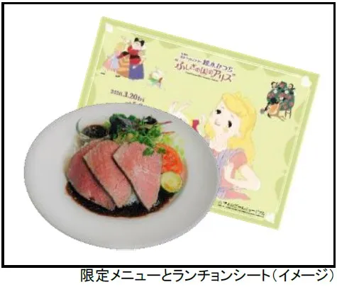 特別展コラボレーションメニューを期間限定で販売します。『アリス』の物語が描かれたイギリスにちなんだメニューを松本かつぢの『アリス』のイラストがデザインされたオリジナルランチョンシートと共にお召し上がりいただけます。