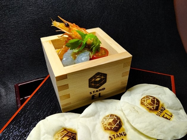 2021年4月20日にオープンしたスタンディングバー『スタンド EL』の看板メニューで、湯豆腐の上にトッピングされたキノコのフレンチソースが美味しいシェフのおすすめEL豆腐。今回お届けするのは、関西電力グループ「海幸ゆきのや」が手掛けた事業で、海洋汚染をはじめとする環境負荷低減などの解決策として、SDGsに寄与する陸上養殖システムで生産された「幸えび」を頭から尻尾まで余すことなく使用し、食品ロス削減も体現できるサスティナブルな一品です。鮮度高くぷりぷりとした触感の生えびの身にわさびのドレッシングを絡め、カラッと揚げた頭と尻尾とともに、升に入ったコクのある京都産冷奴の上にトッピングします。上品で芳醇な旨味と噛むほどにほとばしるエビの甘みを、一尾まるごとご堪能いただけます。