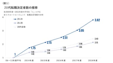 『リクルートエージェント』の転職決定者数の推移をみると、2009年度~2013年度の転職決定者平均人数を1としたときに、20代の転職は2.43倍へ増加している。特に、20代前半の増加率は著しく、3.82倍にも上る(図1)。
