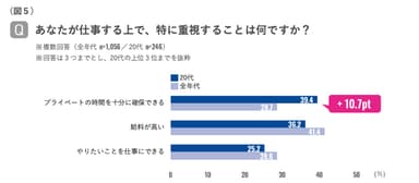 20代の仕事をする上で重視すること(上位3つ回答)は、「プライベートの時間を十分に確保できる」が39.4%で重視されている結果となった。全年代と比較しても10.7ポイント高い。