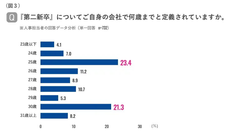 これまで第二新卒とは、概ね社会人経験3年以内を指す意味で言われることが一般的だった。人事担当者向けに行った「『第二新卒』についてご自身の会社で何歳までと定義されていますか」という質問に対して、「25歳まで」23.4%に次いで、「30歳まで」と回答した企業が21.3%に上った (図3)。