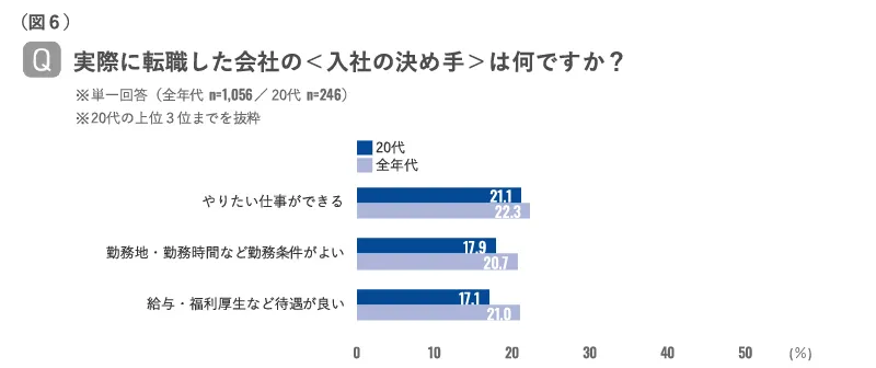 転職先への入社の決め手で最も重視したことは「やりたい仕事ができる」が21.1%で最多であった。次いで「勤務地・勤務時間など勤務条件がよい」17.9%、「給与・福利厚生など待遇が良い」17.1%という結果であったが、それぞれ全年代を下回っていた。