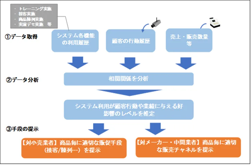本特許は、RetailForceの機能を用いて実現する「販売支援のテクノロジー」を説明するものとなります。この「販売支援のテクノロジー」とは、商品の陳列、店頭デモンストレーションの実施、接客等のお店における販売に関わるさまざまな業務が販売にどの程度、どのように寄与したのか(寄与しなかったのか)を解析することで、小売業各店が業績を上げるための適切な業務やリソースを選定するための(1)データ取得から(2)データ分析、(3)手段の提示を行う技術全体を指します。小売業とともに小売各店に商品を提供するメーカーや、卸会社等の中間業者がこのテクノロジーを具現化するプラットフォームであるRetailForceを共同利用することで、サプライチェーン全体が販売する各商品についての適切なチャネルや販促手段を選定することができます。