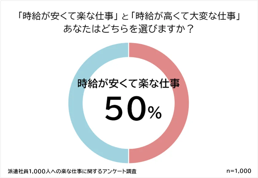 その結果、「時給は安くてもいいから楽な仕事をしたい」と答えた人が50%(1,000人中500人)いることが分かりました。