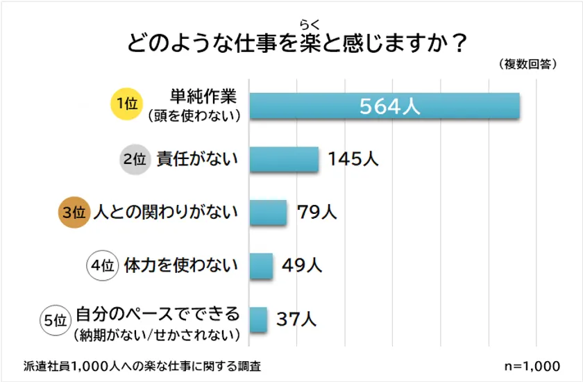 「どのような派遣の仕事を楽と感じるか」の質問に対して、回答数が多かった上位5つをランキング形式でご紹介します。