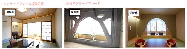 また、改修を行う客室のデザインをマンサードブレースの形状を利用し、特徴的でモダンな和室空間へとリニューアルすることで、耐震補強とデザインを融合させた集客力のある客室を実現しました。他で類を見ない客室はご利用のお客様にも支持されています。