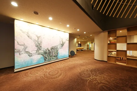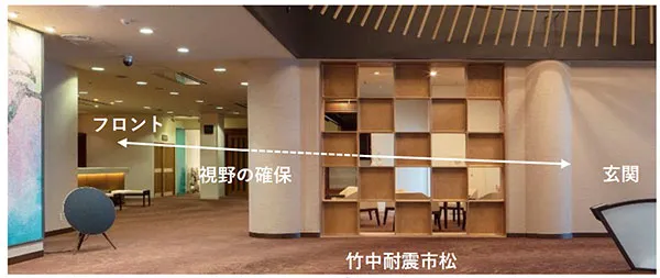 ホテルのエントランスホールにおいては、玄関に来館した宿泊客とフロント間の視線を遮らず、魅力的な空間を演出する為、開放的で美観に優れた鋼製の「竹中耐震市松壁(接着工法)」を採用。