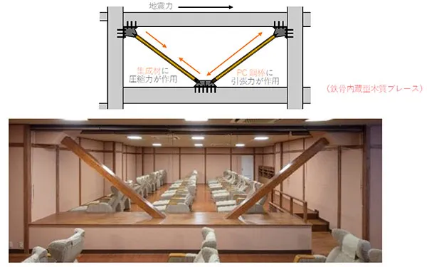 湯上り後の休憩スペースには、ぬくもりのある空間デザインに合わせて、「鋼棒内蔵型木質ブレース」をあらわしで採用しました。圧縮力を集成材で、引張力をPC鋼棒で負担する、木と鉄の長所をうまく利用したブレースであり、木を使用することで環境負荷低減効果も期待できます。