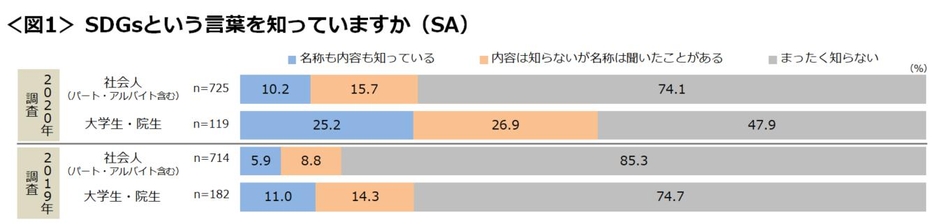 SDGsに対する認知度を2020年に調査した結果と2019年に調査した結果を社会人と大学生・院生で比較すると、どちらも1年間で認知度が大きく向上。特に大学生・院生の認知度向上が顕著であり、【まったく知らない】の割合が半数以下となる結果になった。<図1>