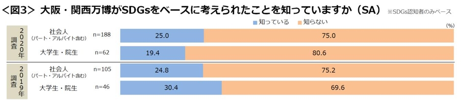 大阪・関西万博がSDGsをベースに考えられたことを知っている人の変化では、社会人でほぼ横ばい、大学生・院生で11.0%減少という結果に。大阪・関西万博の開催が近づき情報発信が活発になることでこの割合も増えていくことが予想される。<図3>