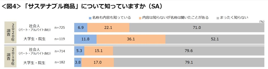 サステナブル商品の認知度の変化ではSDGsの認知度と同様に社会人も大学生・院生も向上。大学生・院生の【名称も内容も知っている】は3.8%から11.8%と約3倍、【内容は知らないが名称は聞いたことがある】は17.0%から36.1%と約2倍増加した。<図4>