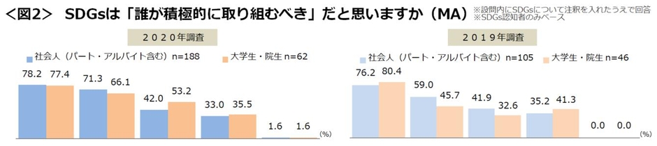 社会人、大学生・院生ともに、SDGsに積極的に取り組むべきなのは国や自治体とした人が約8割と最も多く、昨年とほぼ同様の結果に。しかし、企業や個人・生活者と回答した割合が増えたことからも、SDGsの取り組みに対する意識の変化もうかがえる。<図2>