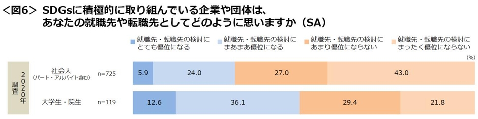 SDGsに積極的に取り組んでいる企業への就職・転職に対する優位性については、大学生・院生の約半数が優位になると回答。大学生・院生にとって、企業や団体のSDGsの取り組み有無も就職先の検討に影響することがわかった。<図6>