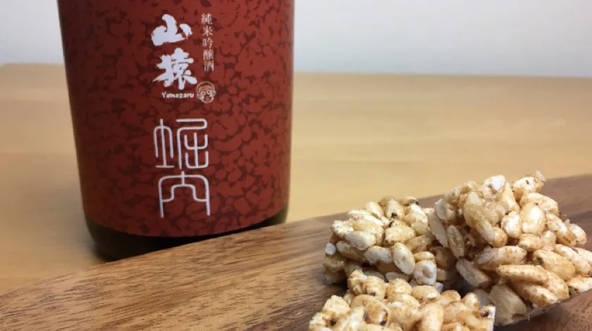 玄米のぽん菓子「朝食用・おやつ用・おつまみ用 各2個」と「大豆やパスタのぽん菓子人気商品の5点セット」。さらにほりうち商店がぽん菓子に合うように厳選した山口県・永山酒造の純米吟醸酒「山猿」ほりうちオリジナルラベル720mlを1本」