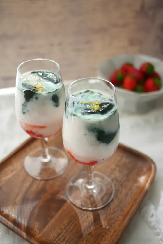 生スピルリナを加えた小豆といちご使ってヘルシーに仕上げた、スーパーフードを摂取できる和スイーツです。