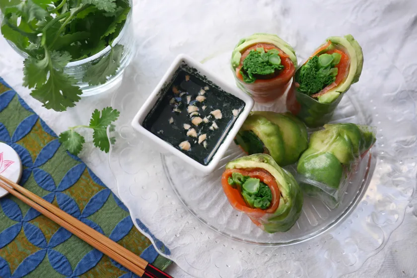 生春巻きのソースに栄養豊富な生スピルリナを加えました。おもてなしシーンに映える華やかでヘルシーな一品です。