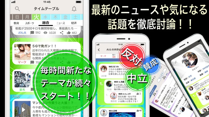 最新のニュースや気になる話題を集中討論するアプリ「UooV」では、毎時間続々と新たなテーマがスタートします。