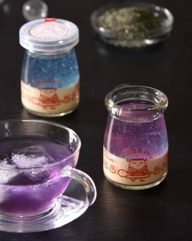 3.ジュレは、バタフライピーというお茶が主原料でやさしい甘さが温泉の湯上りあとを癒します。