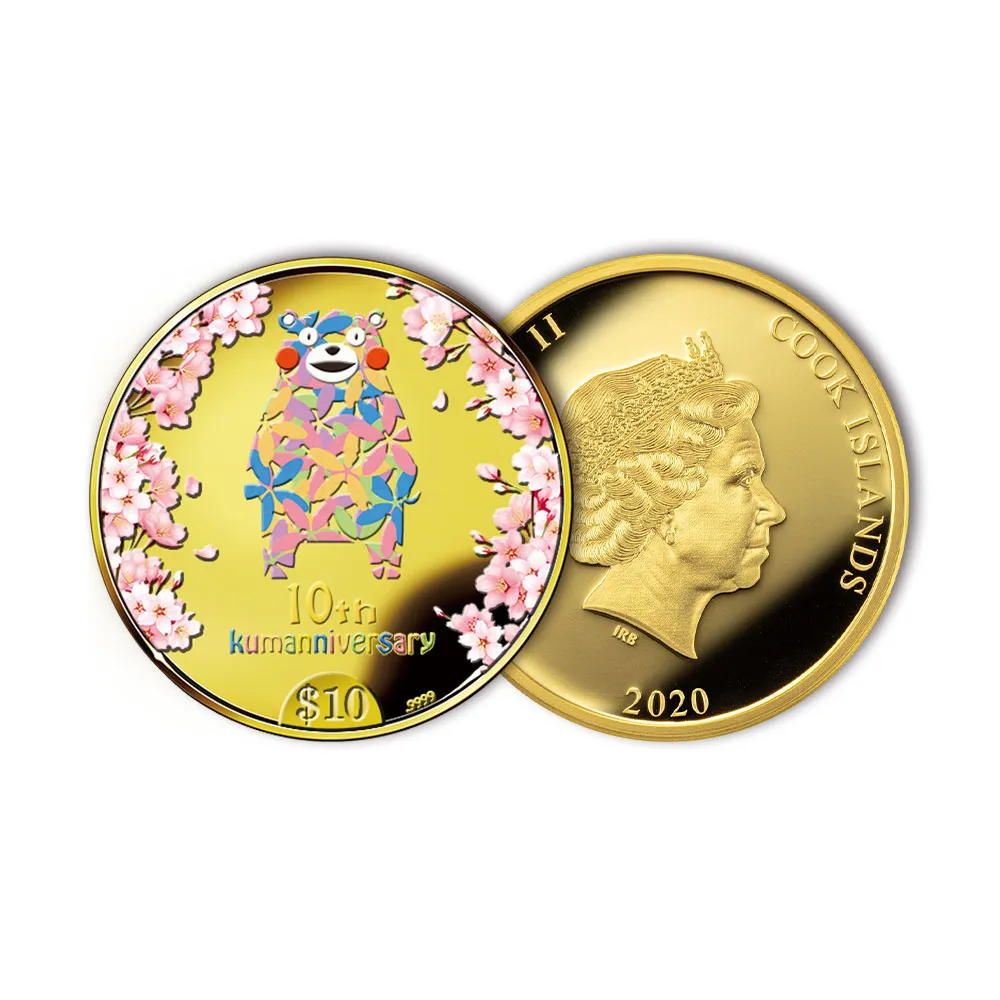 「熊本県営業部長」兼「熊本県しあわせ部長」として、日本の元気をサポートする「くまモン」。その大人気キャラクターのデビュー10周年を記念して、鮮やかなフルカラーのコインが特別発行されました。最高品位の純金・純銀を使用した金貨と銀貨の2種類で、各2020点発行の法定貨幣です。