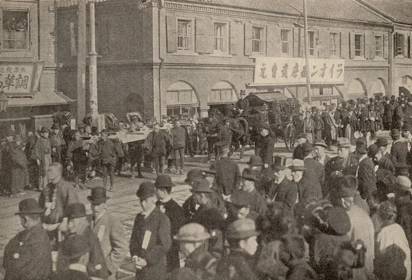 神田柳原河岸(現在の東神田二丁目8番あたり)の小林富次郎商店前から出発する葬列の様子