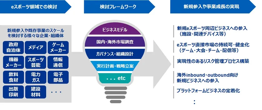 こうした背景をもとに、これまでゲーム産業とは関わりのなかった企業が新規事業としてeスポーツへの参入を検討し始めています。しかし、自社が持つサービスや事業がeスポーツへの参入に可能なのか判断が難しく、今一歩踏み込めない企業が多く見受けられます。一方、既に参入している業界関連企業やeスポーツを用いて地域を盛り上げたい政府・地方自治体にとっても、検討領域の成長戦略策定や持続可能な実行計画への落とし込み、リスク管理プロセスの構築などは現在大きな課題となっています。