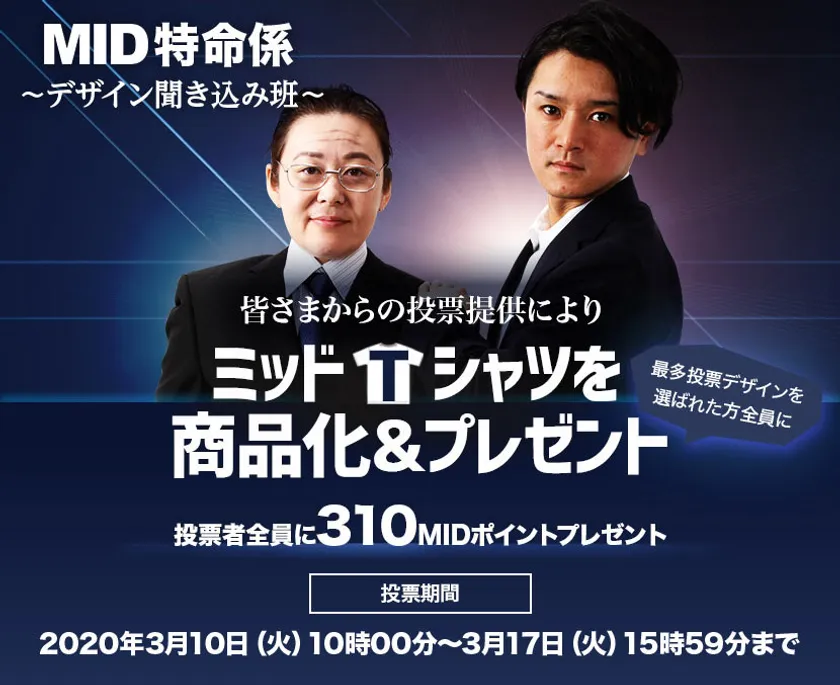 MID特命係デザイン聞き込み班は、お客様に素敵なTシャツを届けたい!と6案のTシャツデザインから商品にするものを迷っています。そこで、お客様に任意で捜査(デザイン投票)に協力していただきたいのです!