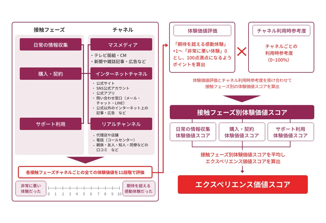 「エクスペリエンス価値スコア」とは、企業とのタッチポイントにおいてユーザーがその時の体験をどのように感じたか、その体験価値をスコア化したものです。「日常の情報収集」「購入・契約時」「サポート利用時」の各接触フェーズについて、ユーザーが利用したチャネルの体験価値評価(「期待を超える感動体験だった」~「非常に悪い体験だった」の11段階)と、利用時の参考度(0~100%)を掛け合わせ、接触フェーズ別に体験価値スコアを抽出、さらにこれらを平均することにより算出します。