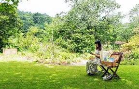 建物に隣接した六甲山の自然を取り入れたイングリッシュガーデンではバラや多年草が最も華やかな季節です。カフェテラスや、ハンモックのエリアでゆったりと過ごせます。