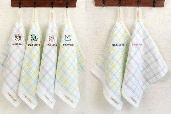 ループつきで園の持ち物用としてお使いいただきやすい大判サイズの、ガーゼと無撚糸の手触りの良いハンドタオルです。名前を刺繍するため毎日の洗濯で消えることはなく、大きくお名前が入っているので取り間違いを防ぐことができます。