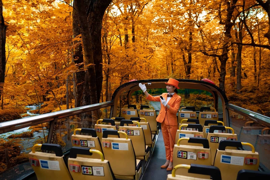 奥入瀬(おいらせ)渓流沿いに建つ唯一のリゾートホテル「星野リゾート 奥入瀬渓流ホテル」は、紅葉が見頃を迎える2021年10月16日~31日の土日限定で、今年も「紅葉プレミアムオープンバスツアー」を実施します。世界屈指の紅葉の名所として知られる奥入瀬渓流は、例年10月中旬から11月初旬にかけて、葉が黄色く色づく「黄葉(おうよう)」がピークを迎え、約70万人(*1)が訪れます。そんな賑わいを増す時期ですが、早朝に行う当ツアーは、昼間とはまったく違った静けさや澄んだ空気を感じながら、歩いてみるのとは違う目線で紅葉を楽しめます。さらに今年は、紅葉コンシェルジュがこのエリアの紅葉の特徴や見どころなどの話をし、紅葉狩りをより楽しめるようになります。黄金の森へと変わりゆく非日常の世界を走り抜ける爽快感や、360度の絶景を存分に味わえます。