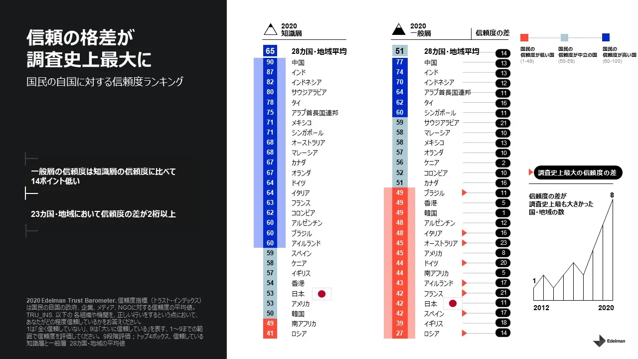 本調査結果の信頼度指標「トラスト・インデックス」(国民の自国の政府、企業、メディア、NGOに対する信頼度の平均値)においては、日本は昨年から3ポイントの上昇を見せたものの、ランキングではブレグジットのイギリスと同位で、昨年同様ロシアに次いで2番目に低い結果となり、依然として自国に対する信頼度の低い国であることが明らかとなりました。