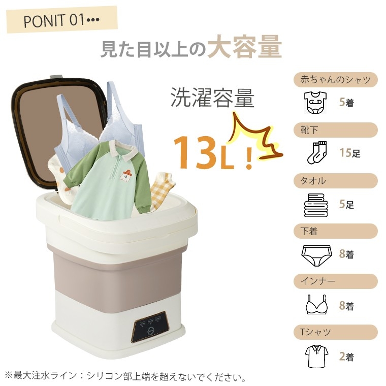 本製品は「小型なのにしっかり洗える」をコンセプトに開発され、13Lの大容量設計と強力な洗浄力を両立しています。さらに、折りたたみ収納に対応しており、使用しない時はコンパクトに保管できるなど、現代のライフスタイルに適した新しい洗濯ソリューションを提供しております。