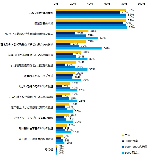 「現在の勤め先が、働き方改革に取り組んでいる」と回答した方に、具体的な取り組み内容を伺うと、第1位は同率で「有給休暇取得の推進」(82%)と「残業時間の削減」(82%)でした。企業規模別に見ると、特に差があったトップ3は「在宅勤務・時短勤務など多様な働き方の推進」(300名未満:17%、300~1000名未満:27%、1000名以上:54%)、 「女性管理職登用など女性活躍の推進」(同:11%、23%、37%)、「フレックス勤務など多様な勤務時間の導入」(同:23%、35%、50%)でした。