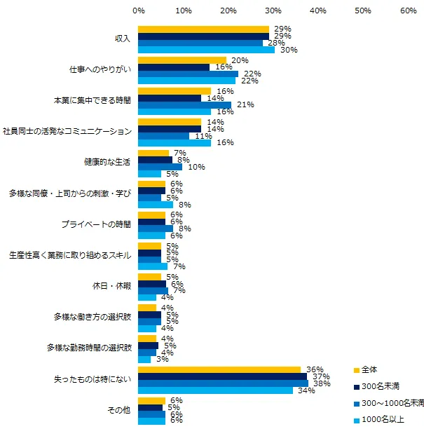 「現在の勤め先が、働き方改革に取り組んでいる」と回答した方に、働き方改革によって失ったものを伺うと、第1位は「収入」(29%)、第2位は「仕事へのやりがい」(20%)、第3位は「本業に集中できる時間」(16%)でした。