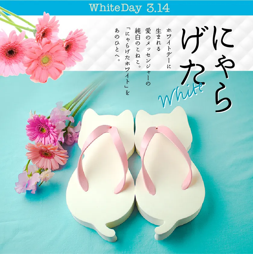 奈良の老舗履物メーカー「なら下駄屋」(運営会社:株式会社一歩、所在地:奈良県御所市、代表:山名 勉)の人気商品「にゃらげた」に、ホワイトデーを記念して、真っ白なにゃらげた「にゃらげたホワイト」を数量限定で2020年2月27日に販売開始いたします。 【“まっしろな”ホワイトデー仕様の「にゃらげた」】