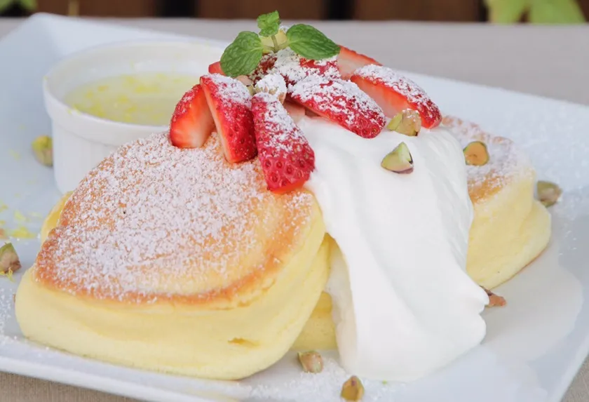 今が旬で、入手可能な質の良い苺を使用し、ローストされたピスタチオと直前に生のレモンの皮をすりおろすことで、フレッシュな香りと上品な味わいが味わえるパンケーキです。