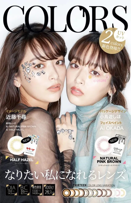 ニュアンスの違う新色2色を付けた2人の近藤千尋がキービジュアルとなり、それぞれ大人な甘さ、カッコよさを表現!!フェイスペイントは、ケーキデコレーションでも話題のAI OKADAさんを起用。また、カラーコンタクトのパッケージには、イラストレーターの小鳥遊しほさんを前回発売のパッケージから起用し今までのカラコンパッケージにないような目を引く可愛いパッケージになっています。