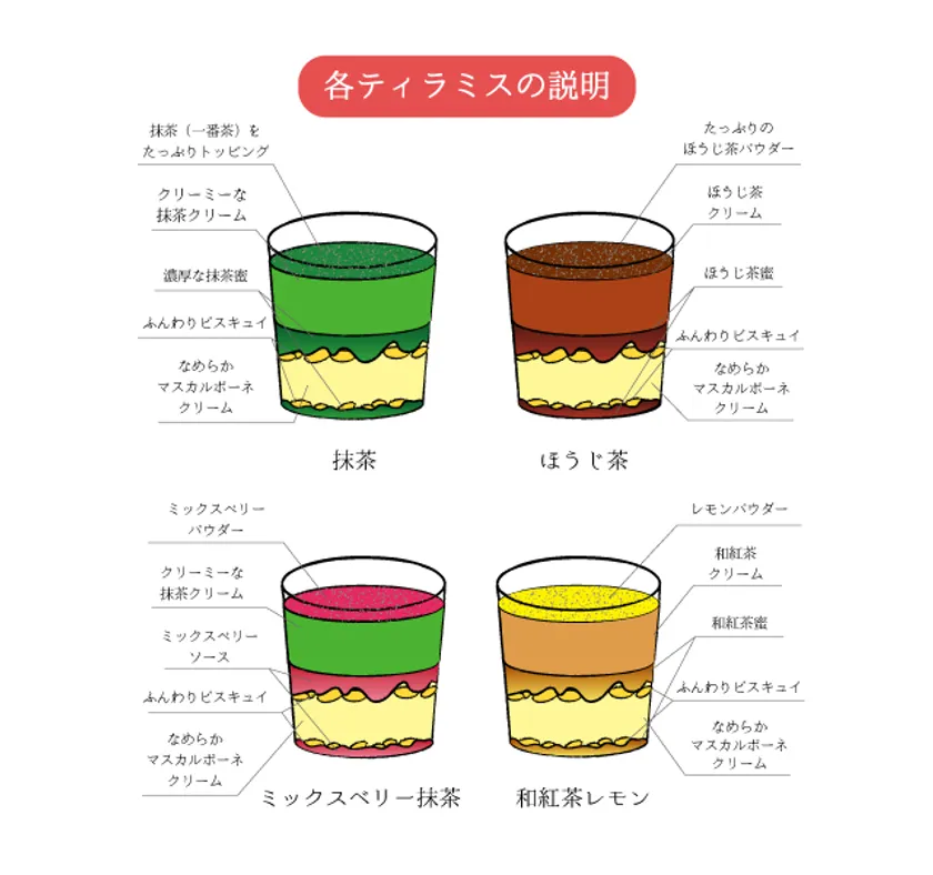 ティラミスは、お茶クリームとマスカルポーネクリームの2層構造。その間を茶葉の旨味を活かした抹茶蜜やほうじ茶蜜と自家製ビスキュイが味わいにアクセントを加えています。