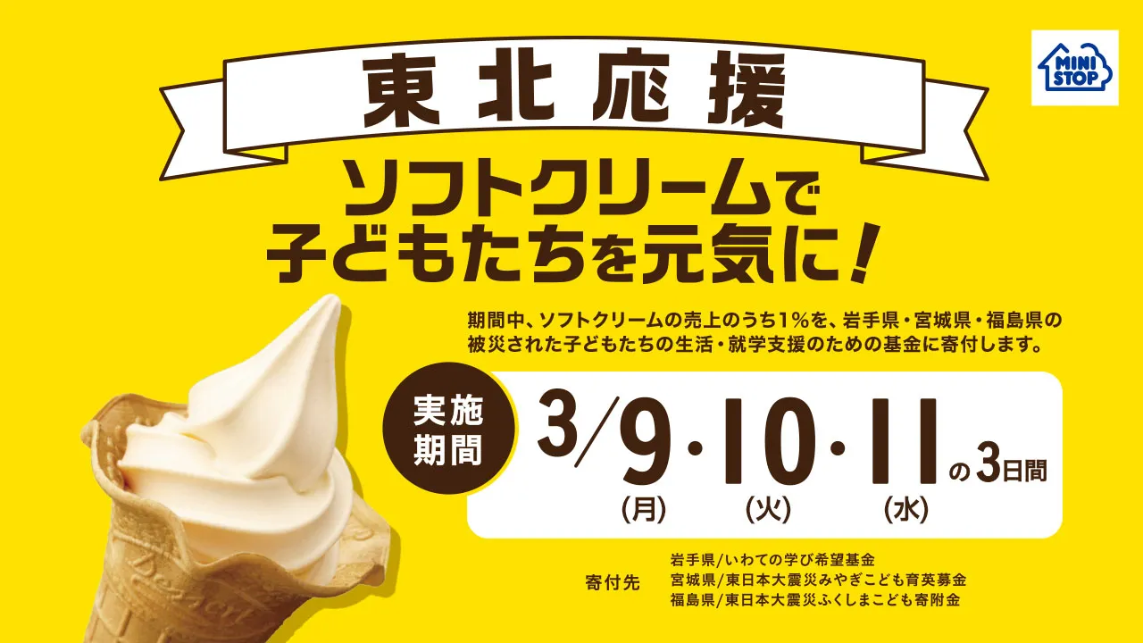ミニストップは、東日本大震災の被災地支援として、イオングループとともに被災地域の復旧・復興に向けたさまざまな取り組みを行っております。本年もミニストップの看板商品「ソフトクリーム」の売上の一部を、岩手県、宮城県、福島県の子どもたちの生活・就学支援のための基金に寄付する取り組みを実施します。