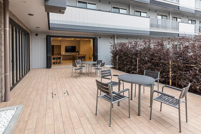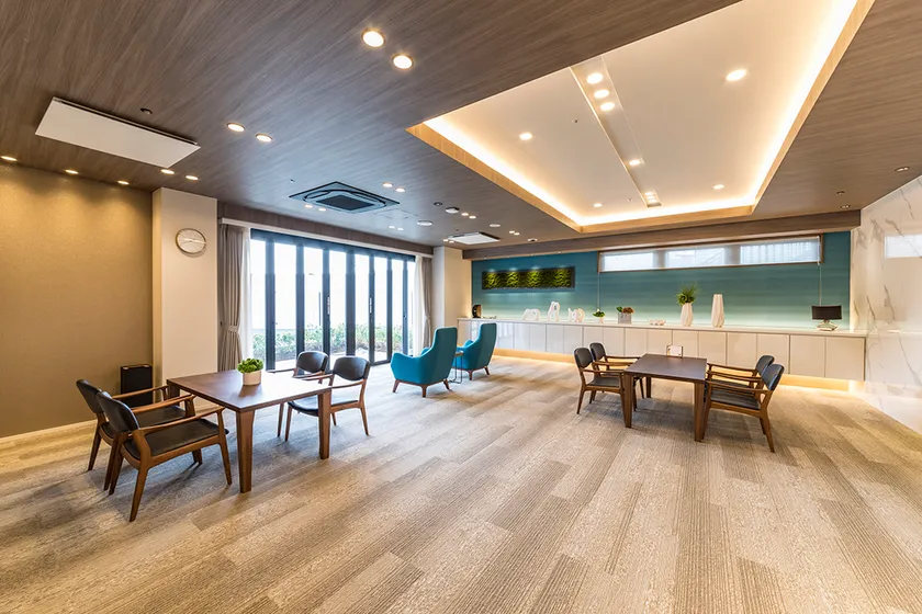 天井が高く、受付のカウンターも低めに設置しているため、入ってすぐに「広さ」を感じさせます。壁紙の色は、横浜の海を連想させるターコイズブルーに。大きな窓を開けるとウッドデッキに繋がっており、壁にも木目を採用しているため、よりオシャレな空間が広がります。ここでは花のポッドなどを掛けられる演出を考えており、ラウンジにゆったりと座って色とりどりの花たちを観賞し、スタッフやご家族と談笑しながら、ティータイムを楽しむことができます。「地域交流」できるスペースも設け、地域交流イベントなどを催すこともできます。