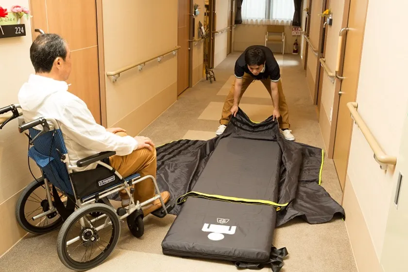 S-CAPEは「スピード」「快適性」「使いやすさ」を追求して、オランダで開発された新しい避難用具です。使い方はとても簡単で、広げて、対象者を寝かせ、マジックテープで安全に固定したら、すぐに避難移動を開始できます。これがあれば寝たきりのお客様もスタッフ1人で避難させることが可能となります。