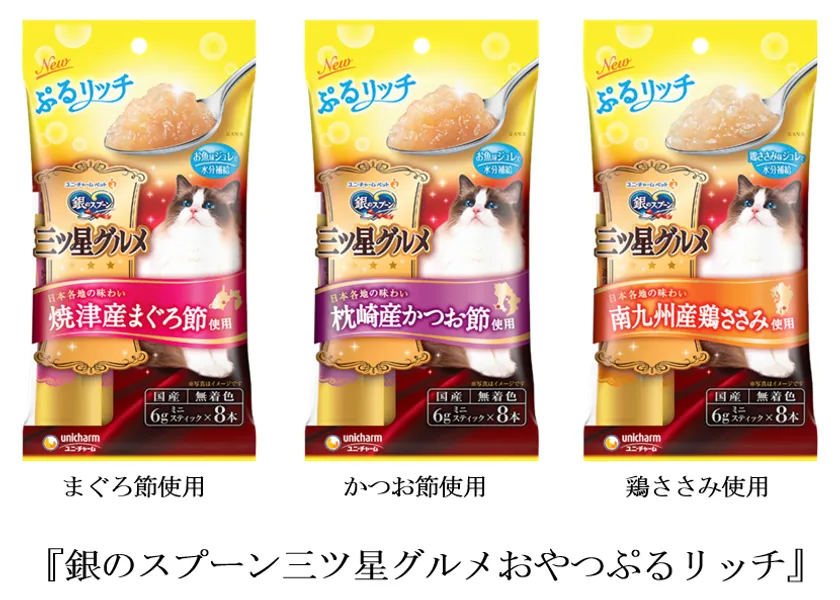 ユニ・チャーム株式会社(本社:東京都港区、代表取締役 社長執行役員:高原豪久)は、ウェットタイプの猫用おやつ『銀のスプーン三ツ星グルメおやつ』シリーズから、日本各地の厳選素材を“ぷるっ”としたお魚味・鶏ささみ味のジュレに溶け込ませた『銀のスプーン三ツ星グルメおやつぷるリッチ』を2020年3月9日より全国で新発売します。