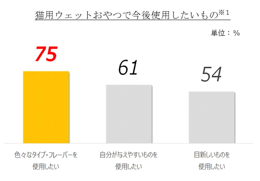 今回新たに、飼育者の約8割※1の方が、猫用ウェットタイプのおやつに対して「色々なタイプやフレーバーを与えたい」と考えていることがわかりました。また、積極的に水分接種をしない猫を不安に思い、食事を通して水分補給ができることを重視する方も増加しています。※2