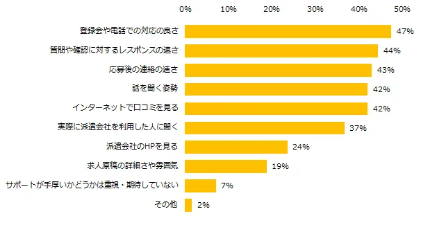 「派遣会社のサポートの質を判断するポイントは何ですか?」と伺うと、トップ3は「登録会や電話での対応の良さ」(47%)、「質問や確認に対するレスポンスの速さ」(44%)、「応募後の連絡の速さ」(43%)でした。