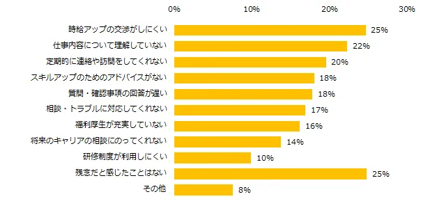 就業中、派遣会社のサポートで良かったと感じた点を伺うと、トップ3は「定期的に連絡や訪問をしてくれる」(42%)、「相談・トラブルに対応してくれる」(35%)、「質問・確認事項の回答が速い」(23%)でした。一方、残念だった点を伺うと、トップ3は「時給アップの交渉がしにくい」(25%)、「仕事内容について理解していない」(22%)、「定期的に連絡や訪問をしてくれない」(20%)でした。具体的なエピソードも紹介します。