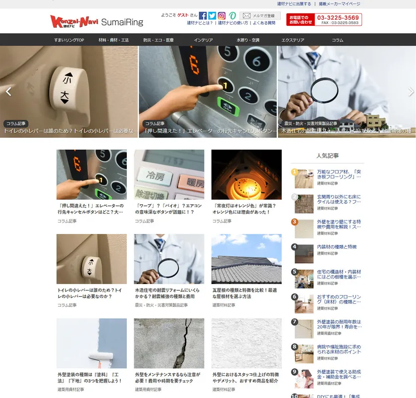 まとめサイト「すまいリング」では、建材を楽しみながらより深く理解していただくために、コンテンツを7つのカテゴリーに分け、それぞれ内容をセグメント化し、建築・建材業界以外の方々にわかりやすく解説しております。